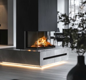 Szyba umieszczona z 3 stron kominka maksymalnie zwiększa wizję ognia i nadaje formie nowoczesności. Tego typu kominek jest często wybierany w przypadku otwartych pomieszczeń, w których łączone są różne przestrzenie, np. salon z jadalnią.