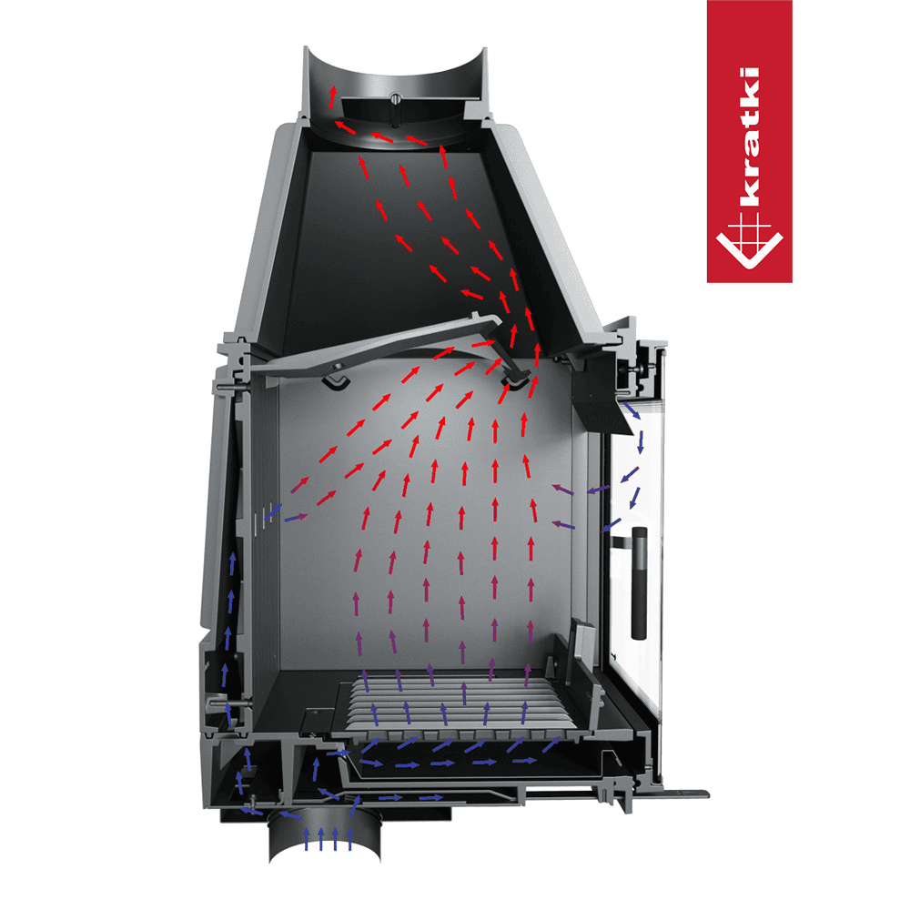 Wkład posiada możliwość zamontowania króćca dolotu powietrza w opcji. Możemy odpowiednimi elementami połączyć powietrze doprowadzone w podłodze. Szczególnie istotne w domach z rekuperacją.