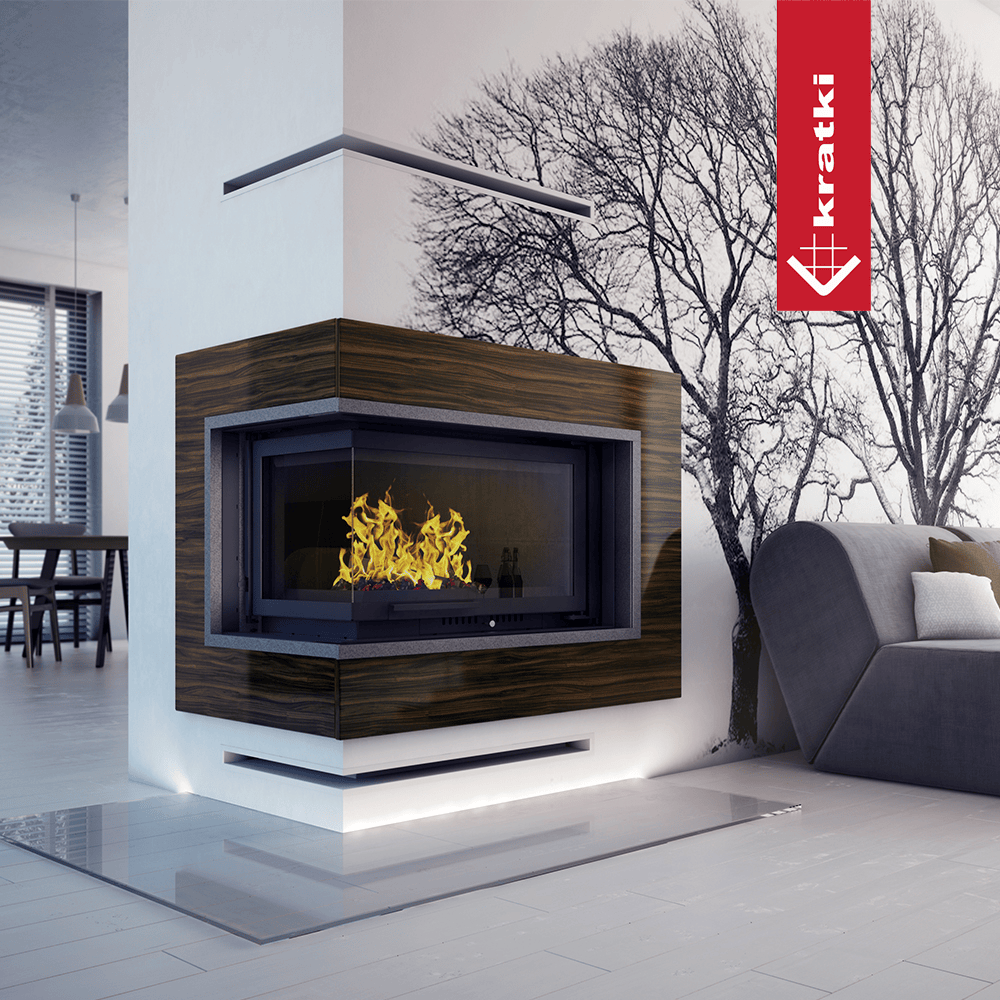 Przeszklenie z dwóch stron zwiększa wizję ognia i doskonale wpisuje się w stylistykę nowoczesnych wnętrz. Tego typu kominek jest często wybierany w przypadku otwartych pomieszczeń, w których łączone są różne przestrzenie, np. salon z jadalnią.