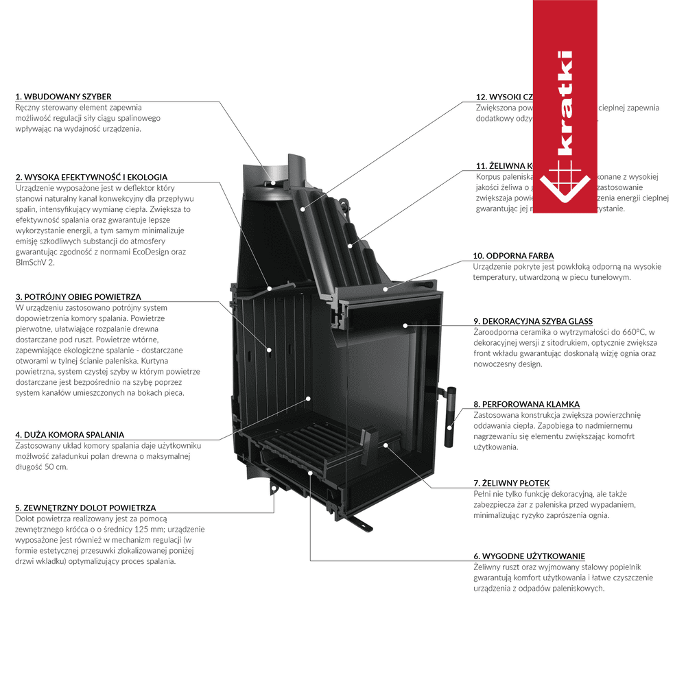 Sterowanie wydajnością spalania za pomocą wbudowanego szybra wpływa na efektywny proces spalania.