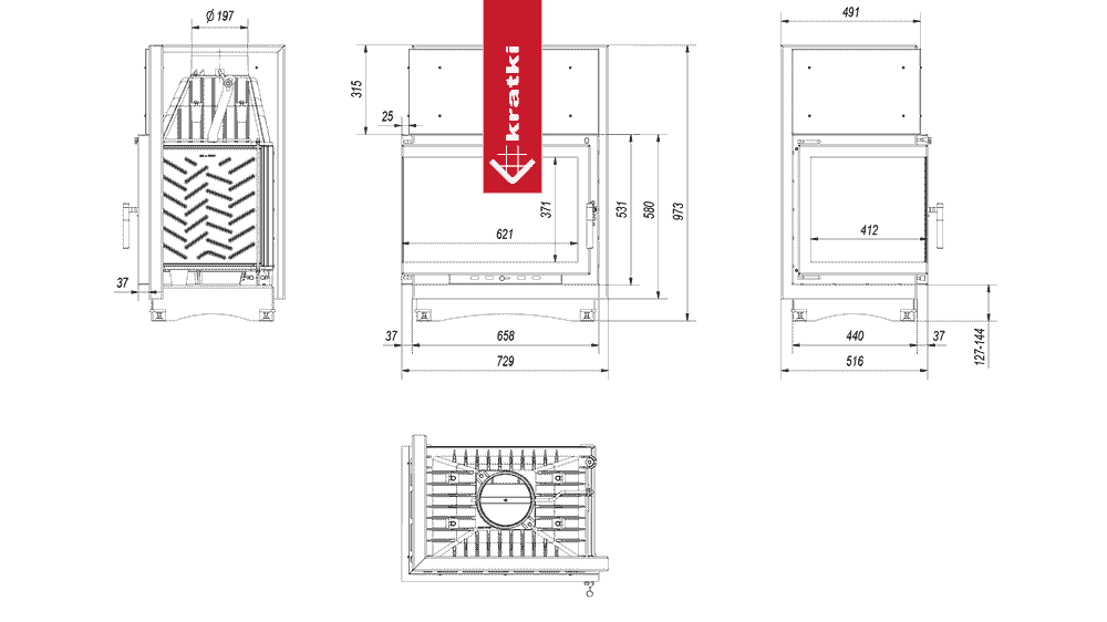 Wykonany z żeliwa, wyjmowany ruszt ułatwia utrzymanie kominka w czystości.