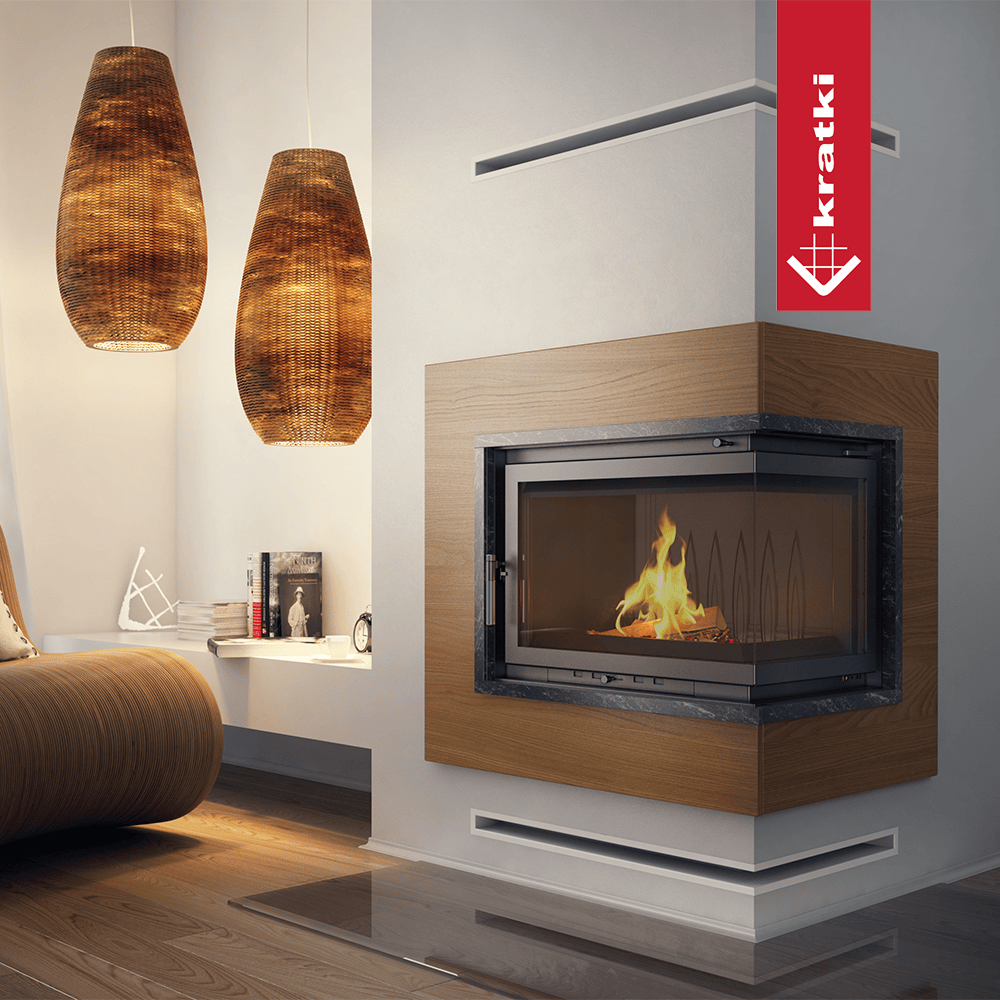 Przeszklenie z dwóch stron zwiększa wizję ognia i doskonale wpisuje się w stylistykę nowoczesnych wnętrz. Tego typu kominek jest często wybierany w przypadku otwartych pomieszczeń, w których łączone są różne przestrzenie, np. salon z jadalnią.
