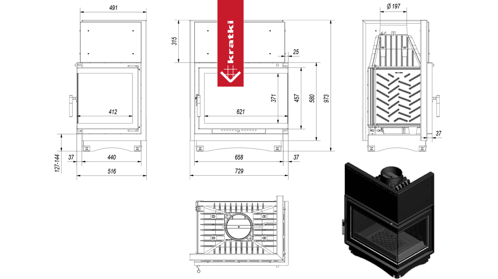 Korpus kominka wykonany jest z żeliwa w połączeniu ze stalowym frontem. Ścianki paleniska o minimalnej grubości 8mm zapewniają solidność konstrukcji, odporność na uszkodzenia oraz długotrwałe utrzymanie ciepła.
