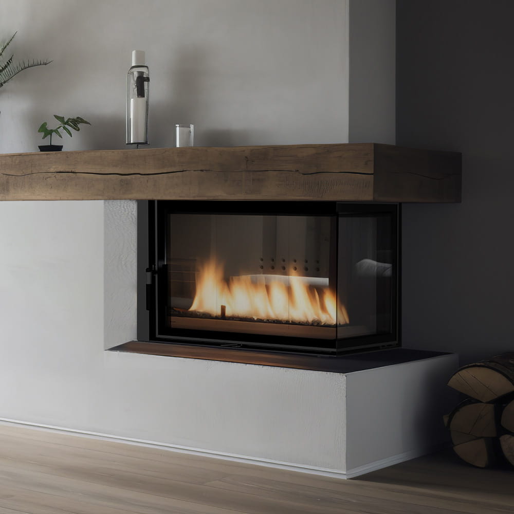 Przeszklenie z dwóch stron zwiększa wizję ognia i doskonale wpisuje się w stylistykę nowoczesnych wnętrz. Tego typu kominek jest często wybierany w przypadku otwartych pomieszczeń, w których łączone są różne przestrzenie, np. salon z jadalnią.