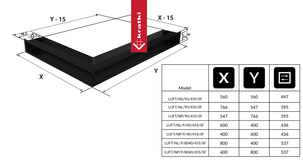 Kratka wentylacyjna kominkowa LUFT narożny lewy 80x40x9 grafitowa Slim