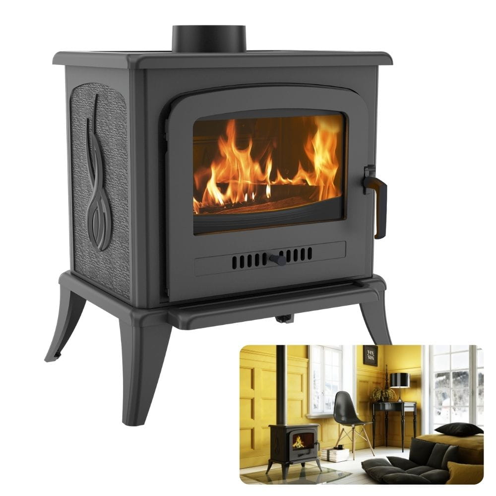 Ozdobne detale na drzwiczkach i bokach pieca, a także jego gięte nóżki, świetnie wpisują się w eleganckie, klasyczne wnętrza, dodając im ciepła i charakteru tradycyjnego paleniska.