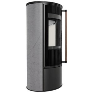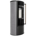 Piec wolnostojący KRATKI ERIK Ø 150 5,5 kW ozdobna ceramika akumulacyjna GRAY SATIN pokrywa stalowa; klamka z drewna egzotycznego Jatoba