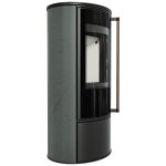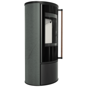 Piec wolnostojący KRATKI ERIK Ø 150 5,5 kW ozdobna ceramika akumulacyjna SERPENTINO pokrywa stalowa; klamka z drewna egzotycznego Jatoba