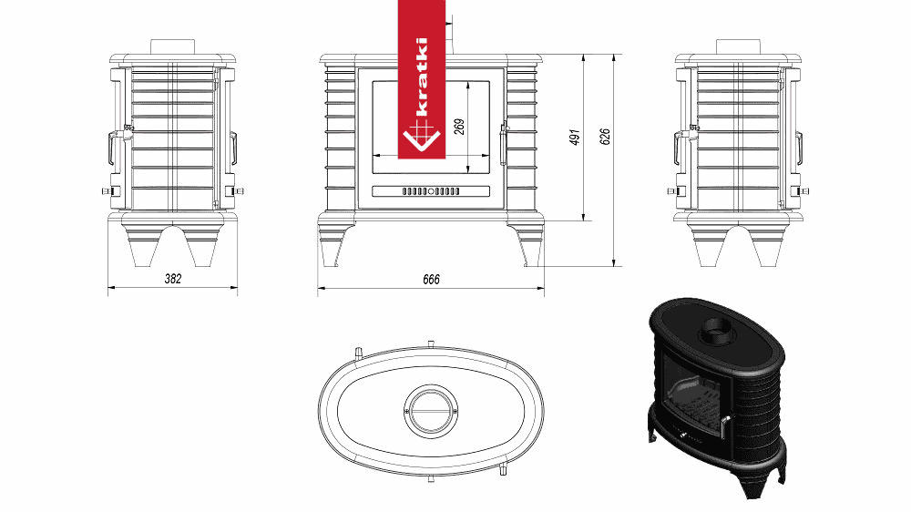 Piec wykonany jest z żeliwa. Ścianki paleniska o minimalnej grubości 8mm zapewniają solidność konstrukcji, odporność na uszkodzenia oraz długotrwałe utrzymanie ciepła.